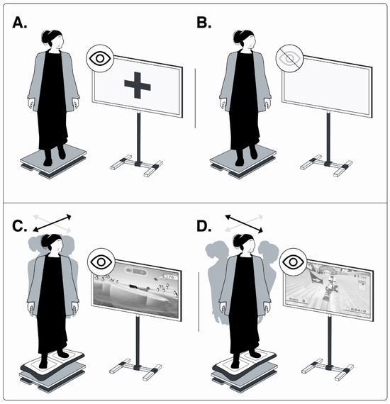 Four postural tasks. Two statics in (A) eyes open and (B) eyes closed; two dynamics in (C) ML weight-shifting exergame, and (D) AP weight-shifting exergame. Grey and black arrows show the mediolateral and anteroposterior displacement, respectively. Image credit: Luis Leiva-Cortez, designer. Unpublished figure, created in its original version for this publication.
