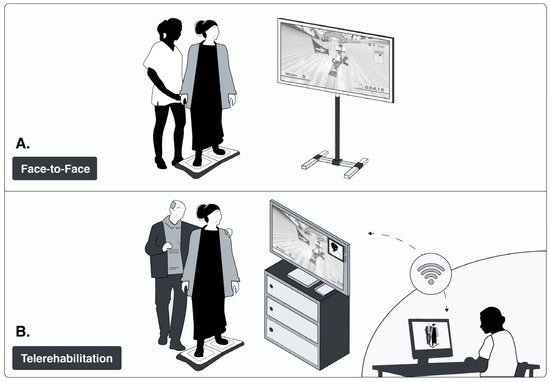 Two Intervention Modalities: (A) Face to face and (B) Telerehabilitation. Image credit: Luis Leiva-Cortez, designer. Unpublished figure, created in its original version for this publication.