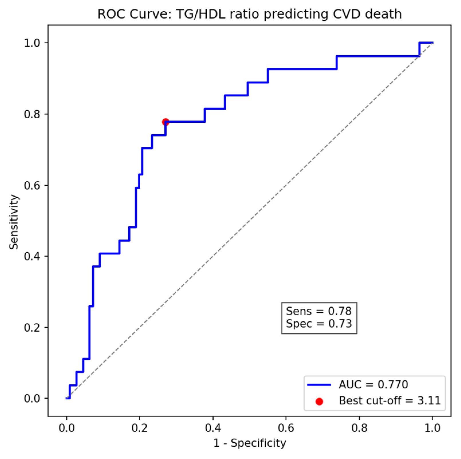 - Kosmas, C.E.; Polanco, S.R.; Bousvarou, M.D.; Papakonstantinou, E.J.; Genao, E.P.; Guzman, E.; Kostara, C.E. The triglyceride/high-density lipoprotein cholesterol (TG/HDL-C) ratio as a risk marker for metabolic syndrome and cardiovascular disease. Diagnostics 2023, 13, 929. [Google Scholar] [CrossRef]