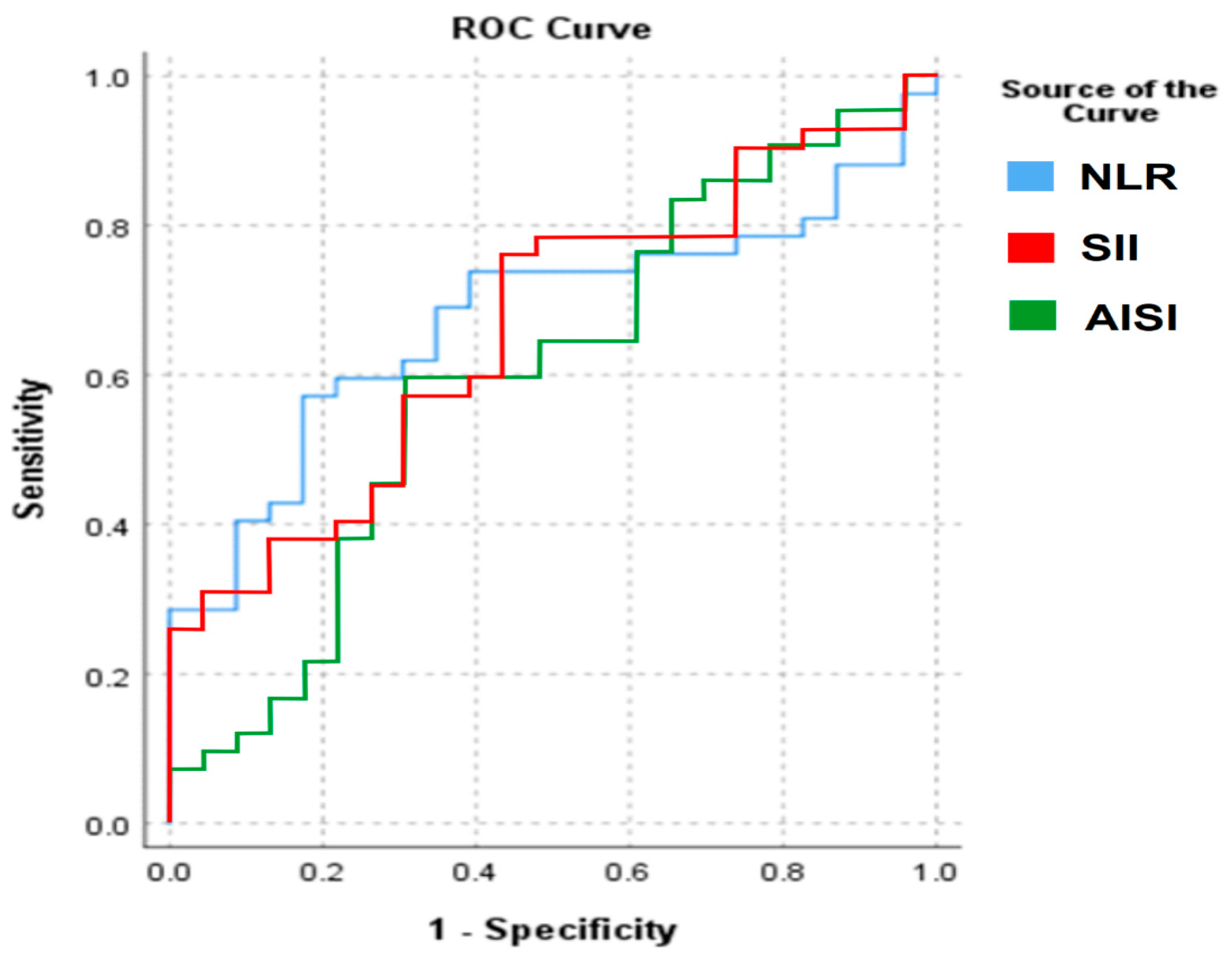 For NLR, the area under the curve (AUC) was 0.677, while for SII the AUC was 0.666, and for AISI the AUC was 0.601. According to standard interpretative thresholds, these values indicate only poor to fair discrimination between patients with testicular cancer and control subjects. The corresponding ROC curves are presented in