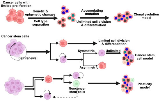Models based on the primary hypotheses on the development of breast cancer. Different models explain tumor heterogeneity—clonal evolution, cancer stem cell, and cellular plasticity models.