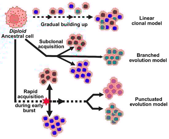 According to the linear clonal model, CNAs start off as a common ancestral cell and gradually build up. The tumor gains a growth advantage with each new CNA, and as the cancer spreads, the initial alterations continue (Figure 3). However, researchers developed a second model, the branched evolution model, because breast tumors frequently exhibit significant genetic variation within and between the primary and metastatic sites [31]. According to this model, distinct subclones or groups of cancer cells, each with a distinct set of CNAs, evolve independently. Another perspective is provided by a more recent concept known as the punctuated evolution model. According to this model, there is an early CNA burst during tumor development, followed by a protracted period of comparatively stable genetic material. These truncal alterations, which are early CNAs, can act as reliable indicators of the cancer’s genesis. CNAs have promise for early detection because they can show up very early, even before symptoms show up or tumors become invasive [28]. Certain CNAs may be used to direct more frequent screenings, preventive treatments, or even risk-reducing surgeries, particularly in high-risk individuals, if they are consistently associated with the early stages of breast cancer or with increased risk. Incorporating these CNA markers into population-wide screening may eventually lead to better results and earlier detection of breast cancer.