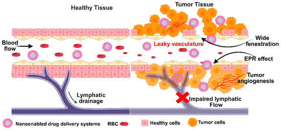 Emerging as essential instruments in the multimodal therapy of cancer, nanoparticles greatly increase the efficacy of chemotherapy, immunotherapy, radiotherapy, and gene therapy [62]. By extending systemic circulation time and minimizing off-target toxicity by preferred accumulation in tumor tissues via the enhanced permeability and retention (EPR) effect (Figure 5), nanoparticulate drug delivery systems improve pharmacokinetic and pharmacodynamic profiles in chemotherapy [63]. Employing targeted drug delivery made possible by these nanocarriers raises therapeutic efficacy and minimizes systemic side effects. Within the field of immunotherapy, which is rapidly developing in oncology, nanoparticles are under investigation for their ability to directly deliver immunomodulating agents to the tumor microenvironment, thus enhancing immune responses and coordinating with other treatment modalities. Allowing the focused delivery of radionuclides or radiosensitizers, increasing tumor-specific radiation doses, and sparing healthy tissue contribute to enhanced therapeutic accuracy and safety in radiotherapy [64]. This method, especially in combination with image-guided radiotherapy methods, enables exact localization of radiation distribution, lowering collateral damage to nearby normal cells and enhancing clinical results. By allowing nanoparticle-based delivery systems, nanotechnology is greatly helping to advance gene therapy for cancer. Easy manufacturing, functionalizing, low immunogenicity, and low toxicity are just a few of the benefits these nanoparticles present. High production costs, scalability, safety, and the complexity of nanosystems restrict their clinical implementation despite their promise in several respects [64]. The physicochemical characteristics of nanoparticles define their biocompatibility and toxicity; hence, strict manufacturing and characterization techniques are required. Safety issues also surround possible long-term health and environmental hazards, including the production of reactive oxygen species that cause inflammation, toxicity, and perhaps damage to neural or dermal tissues. Consequently, nanotoxicology has become a major focus of study to assess and control these hazards in applications of cancer treatment.
