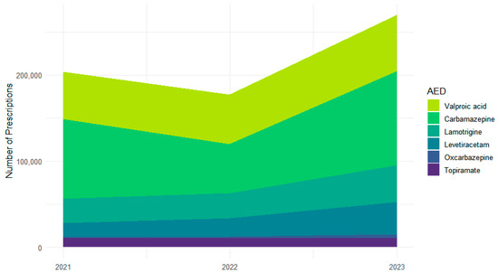 Across 2021–2023, the six most frequently used ASMs accounted for 651,377 prescriptions: carbamazepine (n = 259,202), valproic acid (n = 177,605), lamotrigine (n = 100,180), levetiracetam (n = 74,455), topiramate (n = 33,023), and oxcarbazepine (n = 6912) (Figure 1). Year-specific totals were characterized by a dip and subsequent increase for carbamazepine (92,607 in 2021; 57,023 in 2022; 109,572 in 2023) and steady increases for valproic acid (54,531; 57,594; 65,480), lamotrigine (from 28,147 to 29,327 to 42,706), and levetiracetam (from 16,636 to 20,847 to 36,972). Topiramate remained stable (10,822; 10,645; 11,556). Oxcarbazepine increased from a low baseline (872; 2158; 3882).