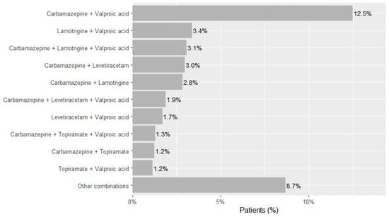 Two-drug regimens accounted for 68.9% of observed combinations (n = 15,214), most frequently carbamazepine and valproic acid (n = 6773; 12.5% of the cohort), lamotrigine and valproic acid (n = 1834; 3.4%), carbamazepine and levetiracetam (n = 1612; 3.0%), carbamazepine and lamotrigine (n = 1542; 2.8%), levetiracetam and valproic acid (n = 924; 1.7%), carbamazepine and topiramate (n = 676; 1.2%), and topiramate and valproic acid (n = 627; 1.2%) (Figure 2). Three-drug regimens accounted for 23.7% of combinations (n = 5244)—dominated by carbamazepine-lamotrigine-valproic acid (n = 1666; 3.1% of the cohort), carbamazepine-levetiracetam-valproic acid (n = 1027; 1.9%), and carbamazepine-topiramate-valproic acid (n = 700; 1.3%). Regimens with ≥4 drugs were uncommon overall (four drugs n = 1397; five n = 228; six n = 7; ~3.0% of the cohort).