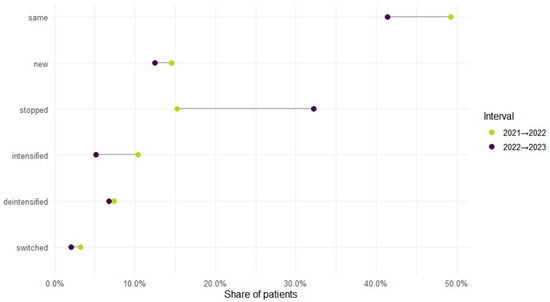 Therapy level varied by year: monotherapy accounted for 70.1% of regimens in 2021, 65.7% in 2022, and 72.4% in 2023, with polytherapy showing the reciprocal pattern (29.9%, 34.3%, 27.6%). Across adjacent years, intensification (mono to poly) occurred in 10.4% from 2021 to 2022 and 5.2% from 2022 to 2023; de-intensification (poly to mono) in 7.4% and 6.8%; and bidirectional switching in 3.2% and 2.1%, respectively. In total, 71.7% (n = 38,924) maintained the same therapy level during observed years, while 28.3% (n = 15,350) changed at least once (Figure 3). Cohort entry and exit were dynamic: 41,364 entered in 2021; 7904 were new in 2022 (14.6% of the cohort) and 5006 in 2023 (9.2%); 8279 ceased to appear in 2022 (15.3%) and 17,464 in 2023 (32.2%).