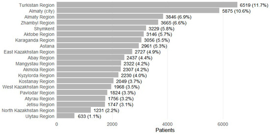 Patients were recorded in 17 regions and 3 major cities (Figure 4). The largest shares were from Turkistan Region (n = 6519; 11.7%) and Almaty city (n = 5875; 10.6%), followed by Almaty Region (n = 3846; 6.9%), Zhambyl (n = 3665; 6.6%), Shymkent (n = 3229; 5.8%), Aktobe (n = 3146; 5.7%), Karaganda (n = 3056; 5.5%), and Astana (n = 2961; 5.3%). Smaller contributions included Ulytau (n = 633; 1.1%) and North Kazakhstan (n = 1231; 2.2%). Prescription volume broadly mirrored patient distributions, with higher absolute numbers in urban centers (for example, Almaty city 133,941 total prescriptions; Astana 53,344), and substantial ASM dispensing alongside comorbidity treatment in high-volume regions (for example, Karaganda 61,172 total; Aktobe 54,646; Almaty Region 56,489; Zhambyl 59,102). Regions with smaller populations had correspondingly fewer prescriptions (for example, Ulytau 5763; North Kazakhstan 13,178).