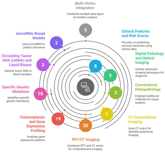 - Transcriptomic and Gene Expression Profiling (n = 19)—Many models included LASSO, autoencoders, and swarm optimization. The outputs ranged from immune subtype classification to gene signature-based survival prediction.