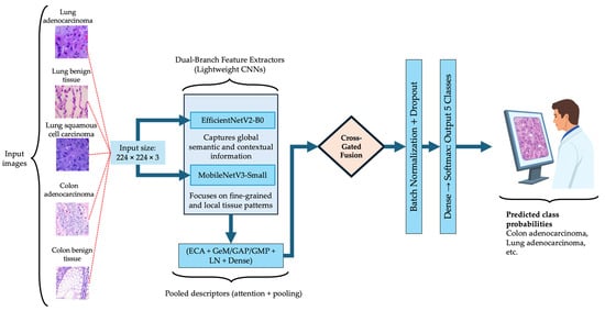 where denotes the feature representation after dual-branch fusion, and are the classification head parameters. The architecture comprises three sequential modules: dual-branch lightweight feature extraction, cross-gated fusion, and hybrid descriptor and classification head. Figure 2 illustrates the overall BiLight-Attn-LC architecture. All images from the LC25000 dataset were resized from their original 768 × 768 resolution to 224 × 224 to comply with the input requirements of EfficientNetV2-B0 and MobileNetV3-Small. The following subsections describe each component of the architecture in detail.
