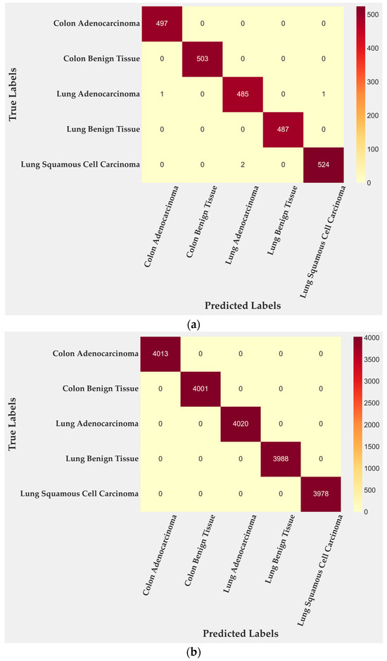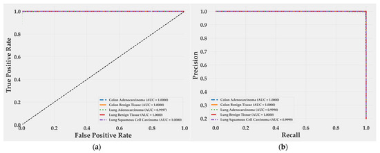 Receiver operating characteristic curves (Figure 6a) show perfect separability for almost all classes, with area under the curve (AUC) values of 1.0000 for Colon Adenocarcinoma, Colon Benign Tissue, Lung Benign Tissue, and Lung Squamous Cell Carcinoma. Lung Adenocarcinoma achieved 0.9997, a negligible difference of 0.03%. Precision–recall curves (Figure 6b) follow the same trend: all classes reach an AUC of 1.0000 except Lung Adenocarcinoma (0.9990) and Lung Squamous Cell Carcinoma (0.9999). Both remain at the upper bound of discriminative performance, confirming that false positives and false negatives are practically absent. These results reflect an extremely well-calibrated decision boundary and a model that preserves recall without sacrificing precision, even in morphologically overlapping subtypes.