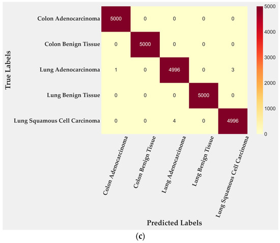 In the test subset, only four of 2500 tiles were misclassified, corresponding to 99.84% accuracy. All errors occurred within malignant lung classes: two tiles from lung adenocarcinoma and two from lung squamous cell carcinoma. Colon adenocarcinoma, colon benign tissue, and lung benign tissue were identified without error. To further quantify this behavior, class-level TPR and FPR were computed from the confusion matrix. Lung adenocarcinoma achieved a TPR of 0.996 with an FPR of 0.0000, while lung squamous cell carcinoma reached a TPR of 0.997 and an FPR of 0.0005. Training performance (Figure 3b) reached complete accuracy, confirming that the cross-gated fusion module captures subtle texture variations. Although perfect training results can suggest mild overfitting, the evaluation on the entire dataset (Figure 3c) reproduced the same error pattern, indicating that the learned representations remain stable rather than memorized. Only four misclassifications remained confined to malignant pulmonary samples, showing that the model generalizes well across folds and organ sites.