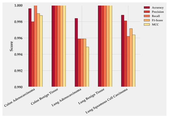 Figure 4 quantifies these class-level results. Colon Benign Tissue and Lung Benign Tissue both reach perfect scores across all metrics. Colon Adenocarcinoma follows closely, with precision 0.9979 and F1-score 0.9989. Lung Adenocarcinoma maintains balanced precision and Recall near 0.996, producing the smallest gap between the two malignant categories. LUSC shows the lowest values: accuracy 0.9989, recall 0.9961, and F1-score 0.9714, which together account for its minor reduction in overall performance. These numbers mirror the confusion matrix and confirm that errors are rare and localized.