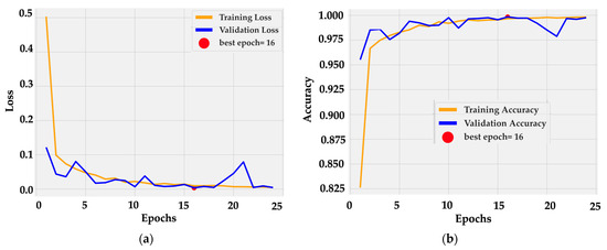 Accuracy curves (Figure 5b) confirm rapid convergence: training accuracy rose from 0.82 to 0.99 by epoch 5 and reached 1.00 near epoch 16. Validation accuracy tracked the same trajectory, fluctuating slightly around 0.99–1.00 without divergence. The near overlap between curves indicates consistent generalization and the absence of overfitting. This behavior is consistent with the architectural design, in which frozen dual backbones provide stable low-level features while the cross-gated fusion layer adapts high-level semantics with minimal parameter drift.