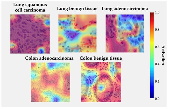 In lung squamous cell carcinoma, activations concentrate over clusters of polygonal cells with dense eosinophilic cytoplasm and keratin pearls, consistent with the histologic hallmarks of squamous differentiation. For lung adenocarcinoma, high activations are observed along glandular or acinar formations and nuclear crowding areas, indicating that the network correctly attends to atypical epithelial arrangements. In benign lung tissue, activations are diffuse and low-intensity, reflecting the absence of neoplastic patterns. Similarly, in colon adenocarcinoma, the model highlights irregular glandular borders and hyperchromatic nuclei located at the invasive front, while benign colon tissue exhibits localized responses restricted to the epithelial lining and lumenal boundaries, suggesting recognition of normal crypt architecture. The absence of strong activations in normal samples and the spatial agreement between attention peaks and diagnostically relevant regions reinforce the model’s interpretability and biological plausibility [33,42,43,51,58].