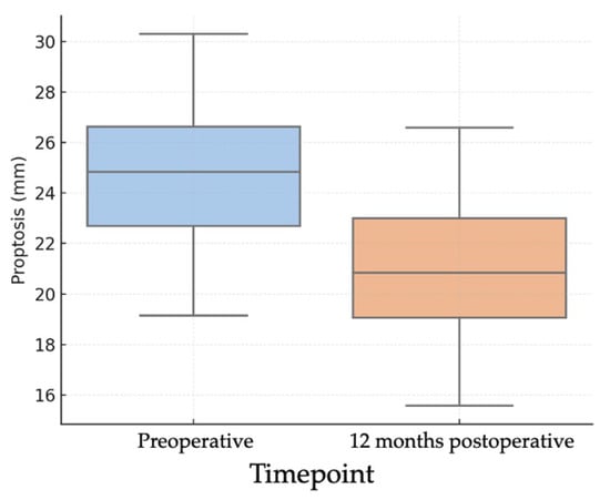 Boxplots of pre- and 12-month postoperative Hertel exophthalmometry (n = 26 orbits) showing median and interquartile range; whiskers denote 1.5 × IQR. Preoperative mean 24.2 ± 2.56 mm; postoperative mean 20.4 ± 2.10 mm; mean difference 3.85 mm (95% CI 3.03–4.68). Paired t test (two-sided), p < 0.001. Effect size: Cohen’s d (paired) ≈ 1.89 s.