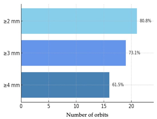 Objective evaluation of proptosis was performed using Hertel exophthalmometry in all 26 orbits. The mean preoperative proptosis was 24.2 ± 2.56 mm, while the postoperative mean was 20.4 ± 2.10 mm, corresponding to a mean reduction of 3.85 mm (95% CI: 3.03–4.68; p < 0.001) (Figure 1). This corresponded to a large effect size (Cohen’s d ≈ 1.89). This mean reduction represents the averaged effect of our standardized endoscopic protocol; the study was not powered for subgroup analyses by baseline proptosis or decompression extent. In the individual analysis of outcomes (Figure 2), 21 orbits (80.8%) achieved a reduction of at least 2 mm, 19 orbits (73.1%) achieved a reduction of at least 3 mm, and 16 orbits (61.5%) achieved a reduction of 4 mm or more.