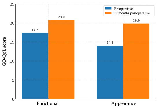 Subjective evaluation of quality of life was performed using the GO-QoL questionnaire, which includes a functional subscale and an appearance subscale. A total of 22 valid questionnaire pairs were obtained (one per patient, except in sequential bilateral cases, in which a second form was administered after the contralateral procedure). On the functional scale, the mean score increased from 17.5 ± 3.95 points to 20.8 ± 3.81 points, with a mean improvement of 3.27 points (95% CI: 1.66–4.88; p < 0.001). On the appearance scale, the mean score increased from 14.1 ± 4.45 points to 19.9 ± 4.01 points, with a mean improvement of 5.77 points (95% CI: 3.94–7.61; p < 0.001) (Figure 3). The functional subscale showed a medium-to-large effect (Cohen’s d ≈ 0.90), and the appearance subscale a large effect (Cohen’s d ≈ 1.39). Despite statistical significance, mean GO-QoL changes did not reach established thresholds for clinically important improvement.