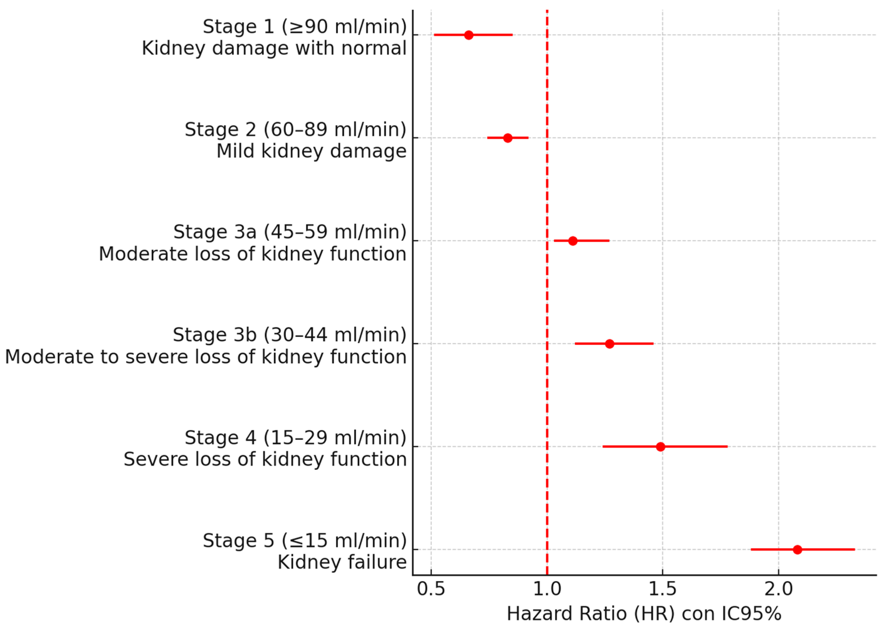 | 4 | eGFR 15–29 mL/min (Severe loss of kidney function) | 52 | 33 | 1.49 (1.24–1.78) | 85 | |