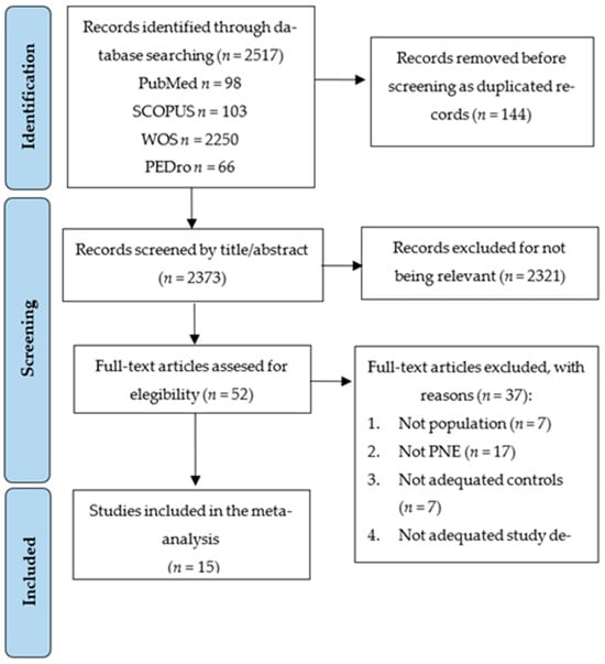 The PRISMA 2020 flow diagram (Figure 1) displays the study selection process. A total of 2517 studies were retrieved from the initial literature search, of which 144 were removed as duplicated. Of the remaining 2373 studies, 2321 were excluded for not being relevant by title/abstract. Fifty-two records were assessed for eligibility, excluding thirty-seven studies that did not meet the inclusion criteria (reasons in Figure 1). Finally, 15 RCTs were included in this SRMA [32,33,34,35,36,37,38,39,40,41,42,43,44,45,46].