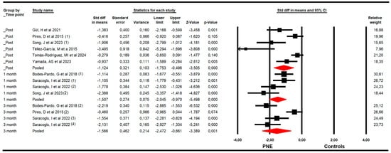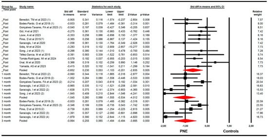 Forest plot of the effectiveness of PNE in reducing pain at the end of the intervention, and at 1 and 3 months of follow-up [32,33,34,35,36,37,38,39,40,41,42,43,44,45].