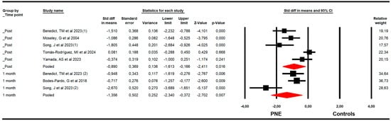 For pain, RCTs included combining data from the Numeric Pain Rating Scale (NPRS), Visual Analogue Scale (VAS for pain), and McGill Pain Questionnaire (MGPQ). Our findings demonstrated that PNE is largely effective in reducing pain just to the end of the intervention (k = 13; n = 712 participants; ns = 54.76 per comparison; SMD = −0.65; 95% CI −1.1 to −0.2; p = 0.005; I2 = 11.1%; Q = 13.5; df = 12; p = 0.34), and at one (k = 6; n = 293 participants; ns = 48.83 per comparison; SMD = −1.05; 95% CI −1.56 to −0.53; p < 0.001; I2 = 0%; Q = 4.5; df = 5; p = 0.48) and three months of follow-up (k = 5; n = 298 participants; ns = 59.6 per comparison; SMD = −1; 95% CI −1.5 to −0.5; p < 0.001; I2 = 4.6; Q = 4.2; df = 4; p = 0.38) (Figure 2). The sensitivity analysis did not report substantial variation in any meta-analysis. The risk of publication bias was not present in any meta-analysis. The risk of publication bias only was suggested (Egger p = 0.26) in the meta-analysis of the post-intervention assessment, in which the variation in effect size after the trim-and-fill estimation (adjusted SMD = −1) was 35% with respect to the original pooled effect (Supplementary Figure S1).
