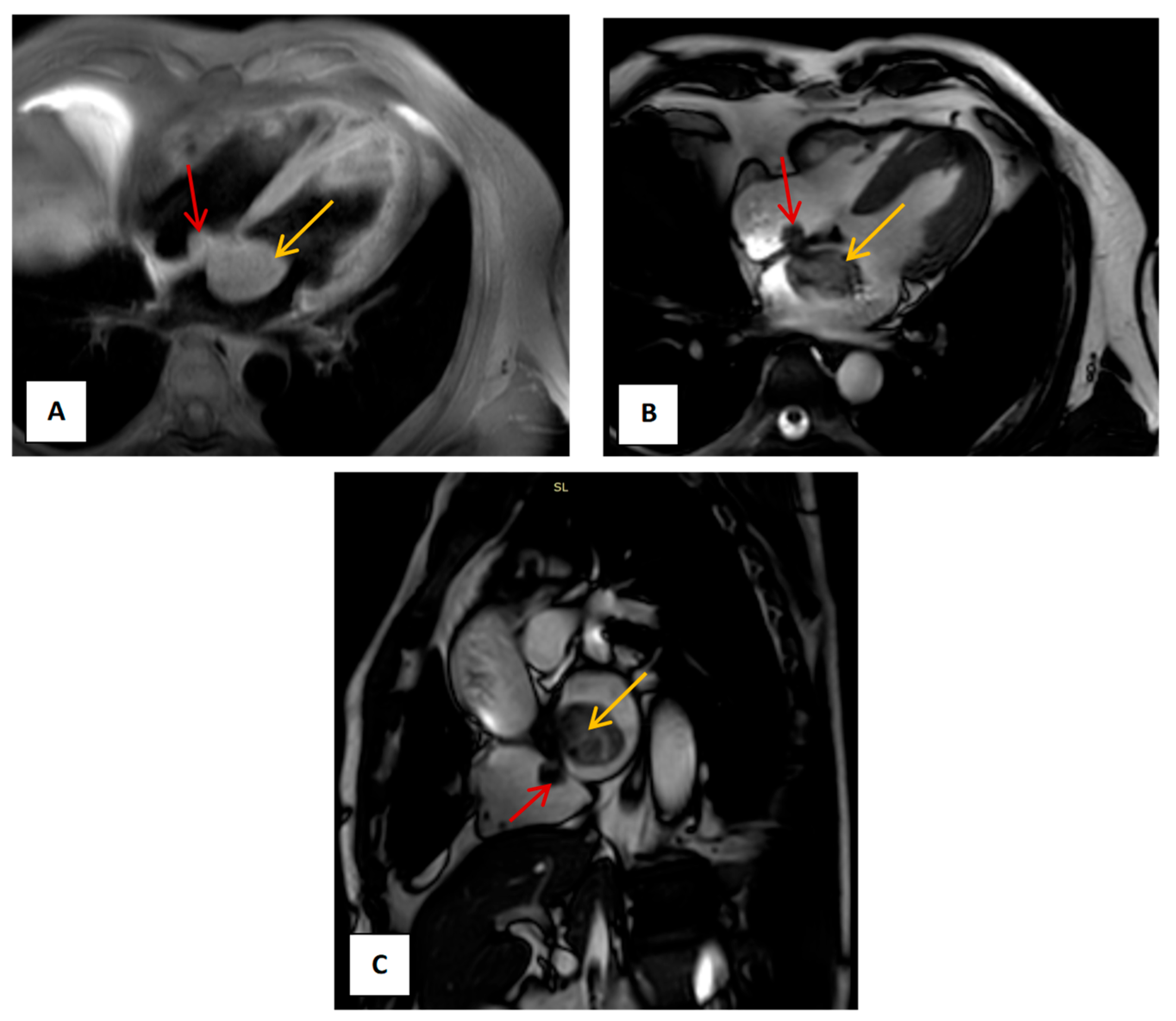 - Vijan, V.; Vupputuri, A.; Chandrasekharan Nair, R. An Unusual Case of Biatrial Myxoma in a Young Female. Case Rep. Cardiol. 2016, 2016, 3545480. [Google Scholar] [CrossRef] [PubMed] [PubMed Central]