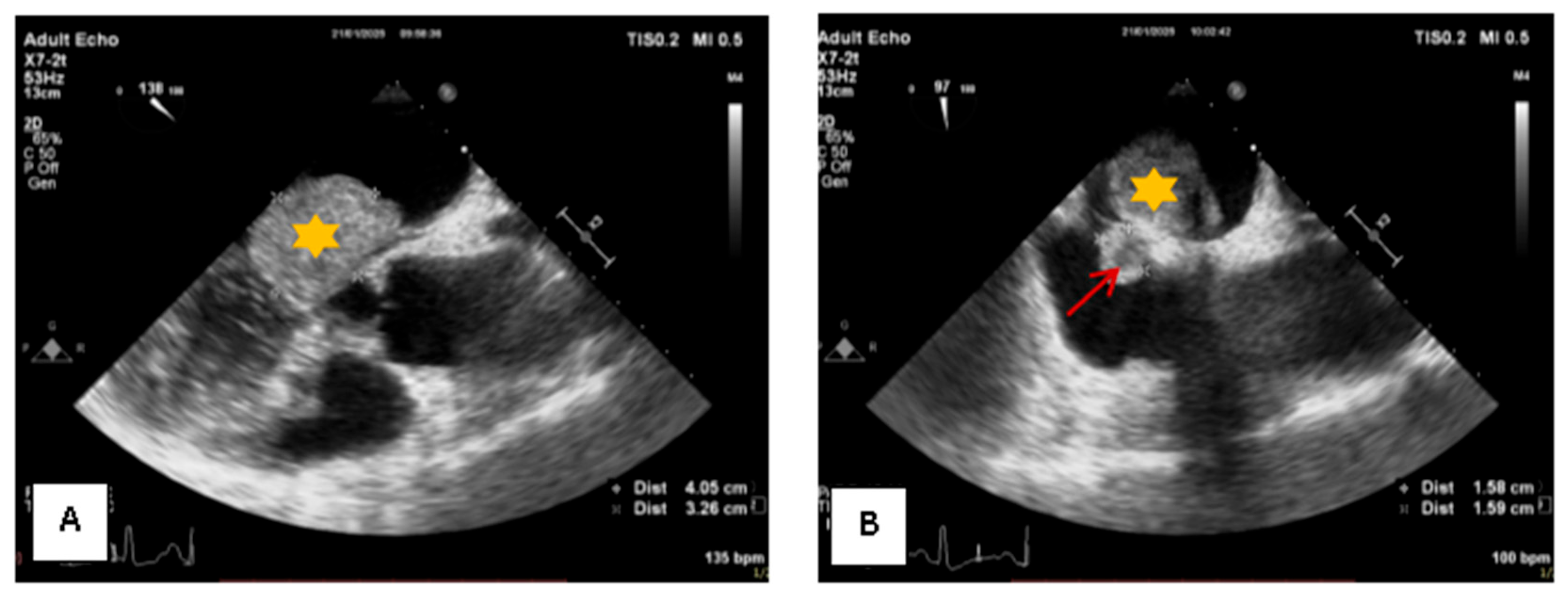 - Munirathinam, G.K.; Kumar, B.; Singh, H. Role of transesophageal echocardiography in the recurrent biatrial myxoma of uncommon origin. Ann. Card. Anaesth. 2022, 25, 85–88. [Google Scholar] [CrossRef] [PubMed] [PubMed Central]