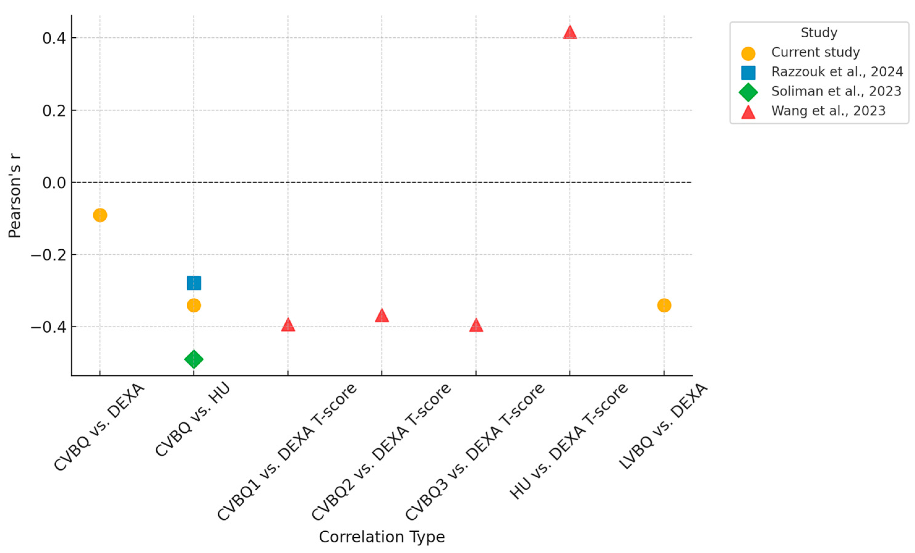 25]. However, factors such as magnetic field strength and bandwidth may still have a minor influence on the scores, potentially contributing to variations in findings. Notably, among the available literature, both studies conducted in North America (which includes this current investigation) found no significant correlation between CVBQ and either HU or DEXA. In contrast, two well-conducted studies of similar methodology in China demonstrated strong correlations with DEXA T-scores [