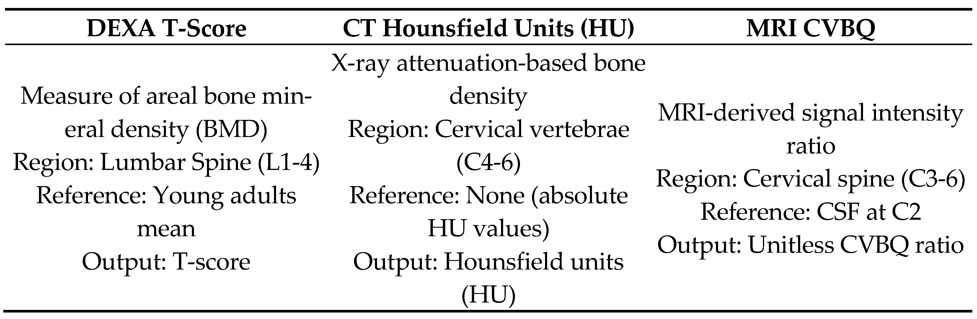Figure 2). To illustrate the relationship between these imaging-based bone-quality methods, we created a schematic overview comparing DEXA T-scores, CT HU, and MRI-derived CVBQ (