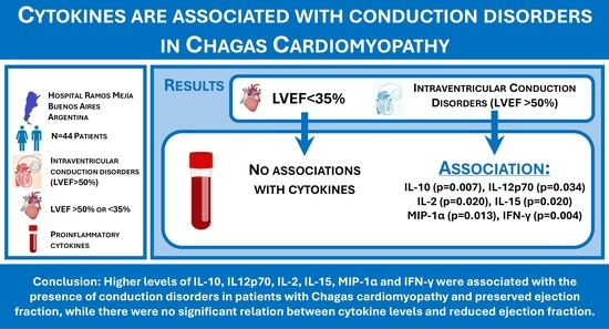 - Principato, M.B.; Paolucci, A.; Miranda, S.; Lombardi, M.G.; Sosa, G.; Von Wulffen, M.A.; Villafernández, R.O.C.Í.O.; Tomatti, A.; Di Girolamo, G.; Carbajales, J. Asociación entre interleuquinas inflamatorias y la presencia de trastornos intra-ventriculares de la conducción en pacientes con serología positiva para enfermedad de Chagas y función ventricular conservada. Rev. Argent. Cardiol. 2021, 89, 130–134. [Google Scholar] [CrossRef]