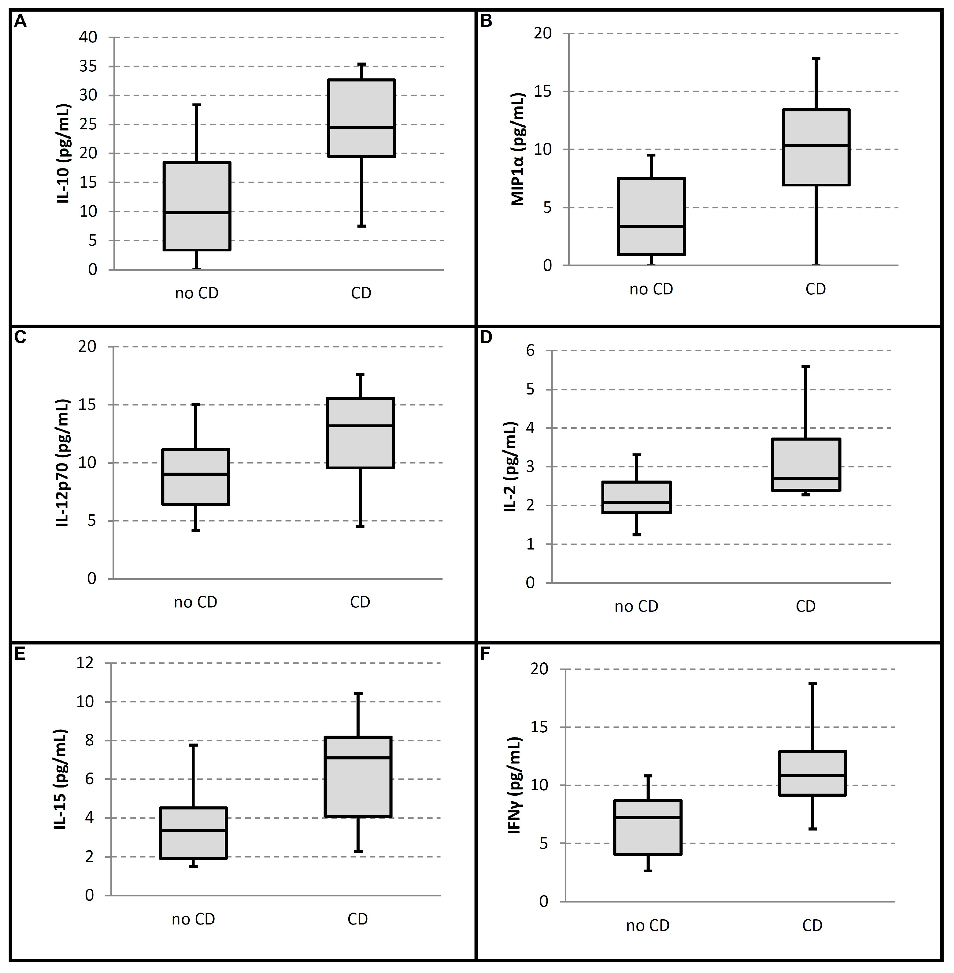 | MIP1α | 6.921 (2.091–9.201) | 8.236 (0.603–11.135) | 0.864 |