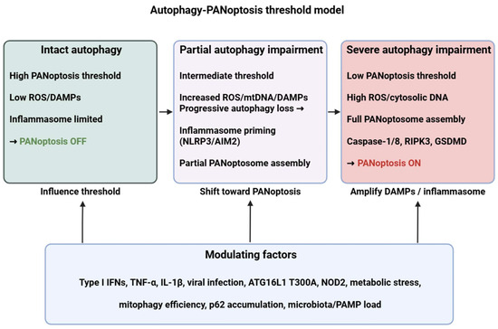 Autophagy–PANoptosis threshold model. Intact autophagy maintains a high activation threshold for PANoptosis by removing damaged organelles and inflammasome components. Progressive autophagy impairment (due to genetic variants, infection, cytokine milieu or metabolic stress) increases ROS/DAMPs and primes inflammasomes (NLRP3/AIM2), lowering the threshold for PANoptosome assembly (ZBP1/AIM2/ASC/caspase-8/RIPK3) and eventually engaging PANoptosis (caspase-1/8, RIPK3, GSDMD). ROS: reactive oxygen species; DAMP: danger-associated molecular pattern; mtDNA: mitochondrial DNA; NLRP3: NLR family pyrin domain containing 3; AIM2: Absent in melanoma 2; RIPK3: Receptor-interacting protein kinase 3; GSDMD: Gasdermin D; IFN: interferon; TNF: tumor necrosis factor; IL: interleukin; ATG16L1: autophagy related 16 like 1; NOD2: nucleotide binding oligomerization domain containing 2; PAMP: pathogen-associated molecular pattern. Figure was partly created with https://biorender.com/ (accessed on 4 December 2025).