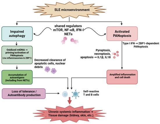 Autophagy—PANoptosis interaction in adaptive immune cells. IFN: interferon; SLE: systemic lupus erythematosus; RA: rheumatoid arthritis; ZBP1: Z-DNA-binding protein 1; RIPK3: Receptor-interacting protein kinase 3; NLRP3: NOD-, LRR- and pyrin domain-containing protein 3.