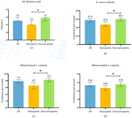 Echocardiographic variables between sarcopenic and non-sarcopenic subjects in RHF. (a) RV Thickness wall, (b) E-wave velocity, (c) Mitral lateral e’velocity and (d) Mitral medial velocity. * p-value < 0.005 between sarcopenia and non sarcopenia.