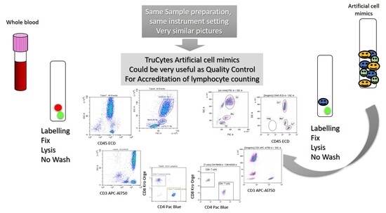 Recently, synthetic products mimicking human leukocytes have been commercialized by Slingshot Biosciences (Inc. Emeryville, CA) as “artificial cell mimics” for use as QC in flow cytometry analyses: FlowCytes and TruCytes. FlowCytes are described as “synthetic white blood cells” intended as a forward and side scatter control for the identification and analysis of lymphocytes, monocytes, and granulocytes in whole blood. They are provided in suspension, ready to use, and can be shipped and stored at room temperature. TruCytes are cell mimics that, in addition, feature the following leukocyte surface markers according to the manufacturer: CD3 (using SK7 clone), CD4 (SK3), CD8 (SK1), CD16 (B73.1), CD19 (SJ25C1), CD45 (2D1), CD56 (NCAM16.2), and CD14. TruCytes are provided lyophilized, to be shipped and stored at −20 °C, in single test vials. The manufacturer recommends that upon reconstitution, TruCytes should be used within seven days if stored at 2–8 °C. Three washing steps are recommended but not mandatory. Data acquisition should be performed at a low flow rate. The manufacturer states that erythrolysis can be used safely on labeled TruCytes™. However, there are no specific instructions regarding the immunolabelling procedure (time and temperature) or fixation procedure. Neither FlowCytes nor TruCytes are IVD-certified; they are for Research Use Only (RUO).
