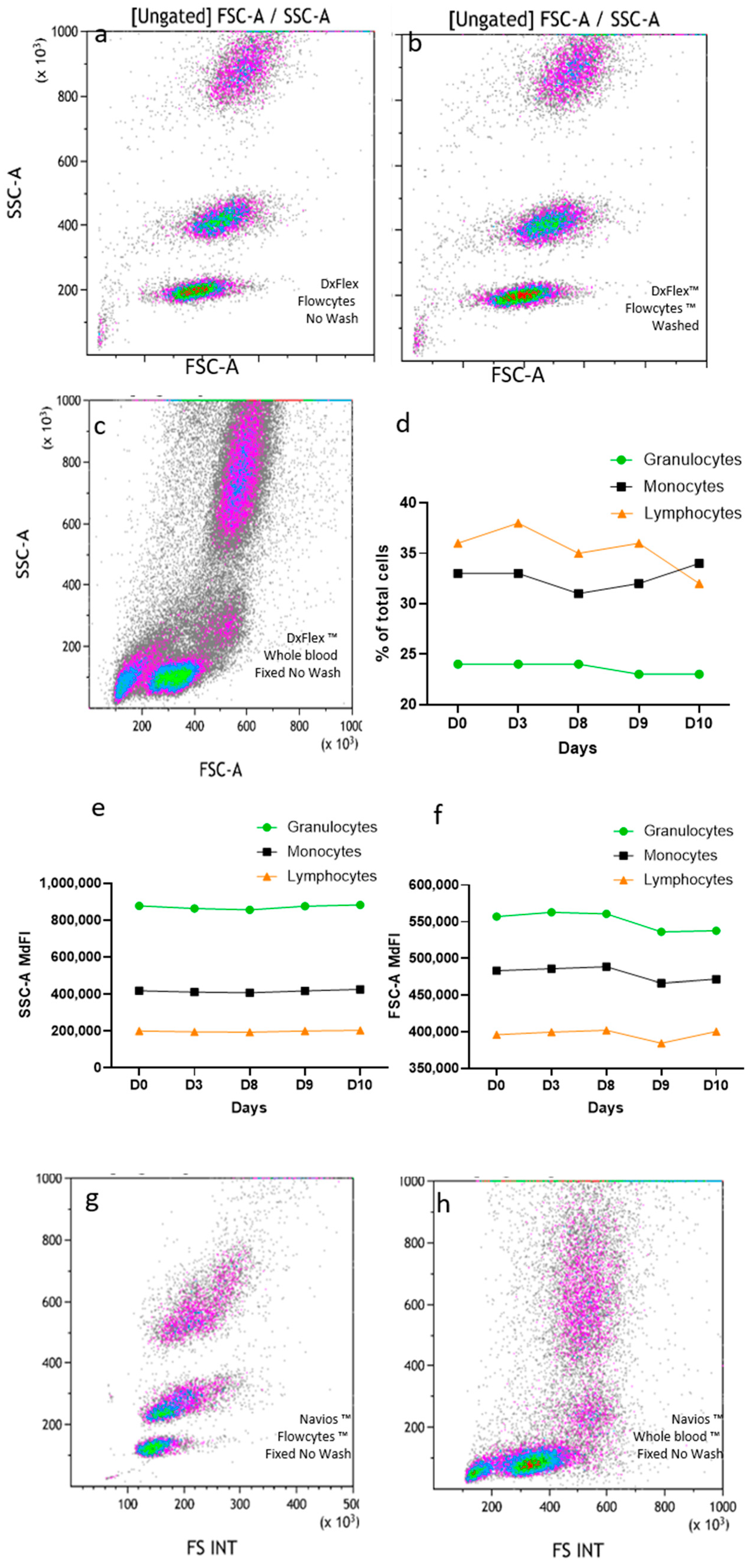 FlowCyte forward/side scatters on DxFLEX: lysis, fixation, and no washing (a) or with washing (b) compared to human blood (c). FlowCyte stability was checked daily for ten days, regarding subset proportions (d), SSC (e), and FSC (f). FlowCyte forward/side scatters on Navios (g) compared to human blood (representative result; (h)) with the lysis, fixation, no-wash protocol.