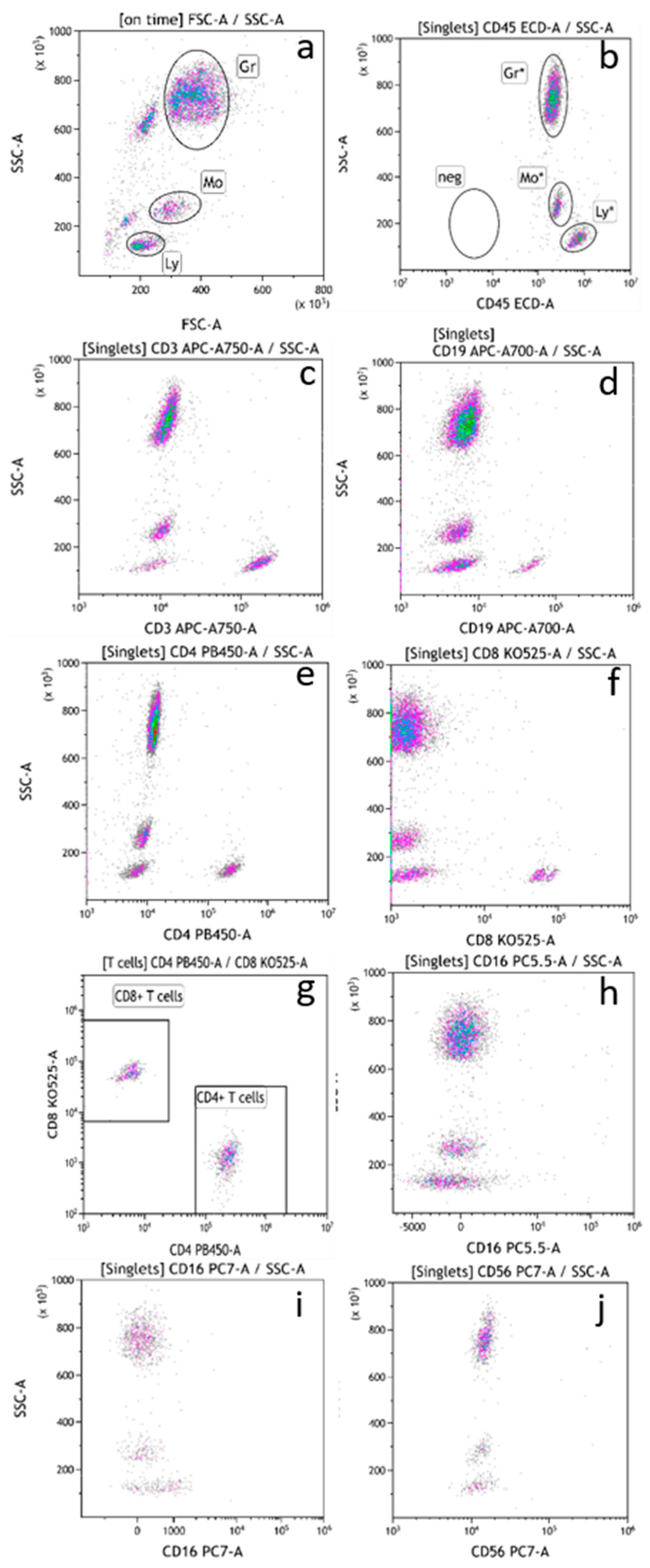 - Nicholson, J.K.; Hubbard, M.; Jones, B.M. Use of CD45 fluorescence and side-scatter characteristics for gating lymphocytes when using the whole blood lysis procedure and flow cytometry. Cytometry 1996, 26, 16–21. [Google Scholar] [CrossRef]