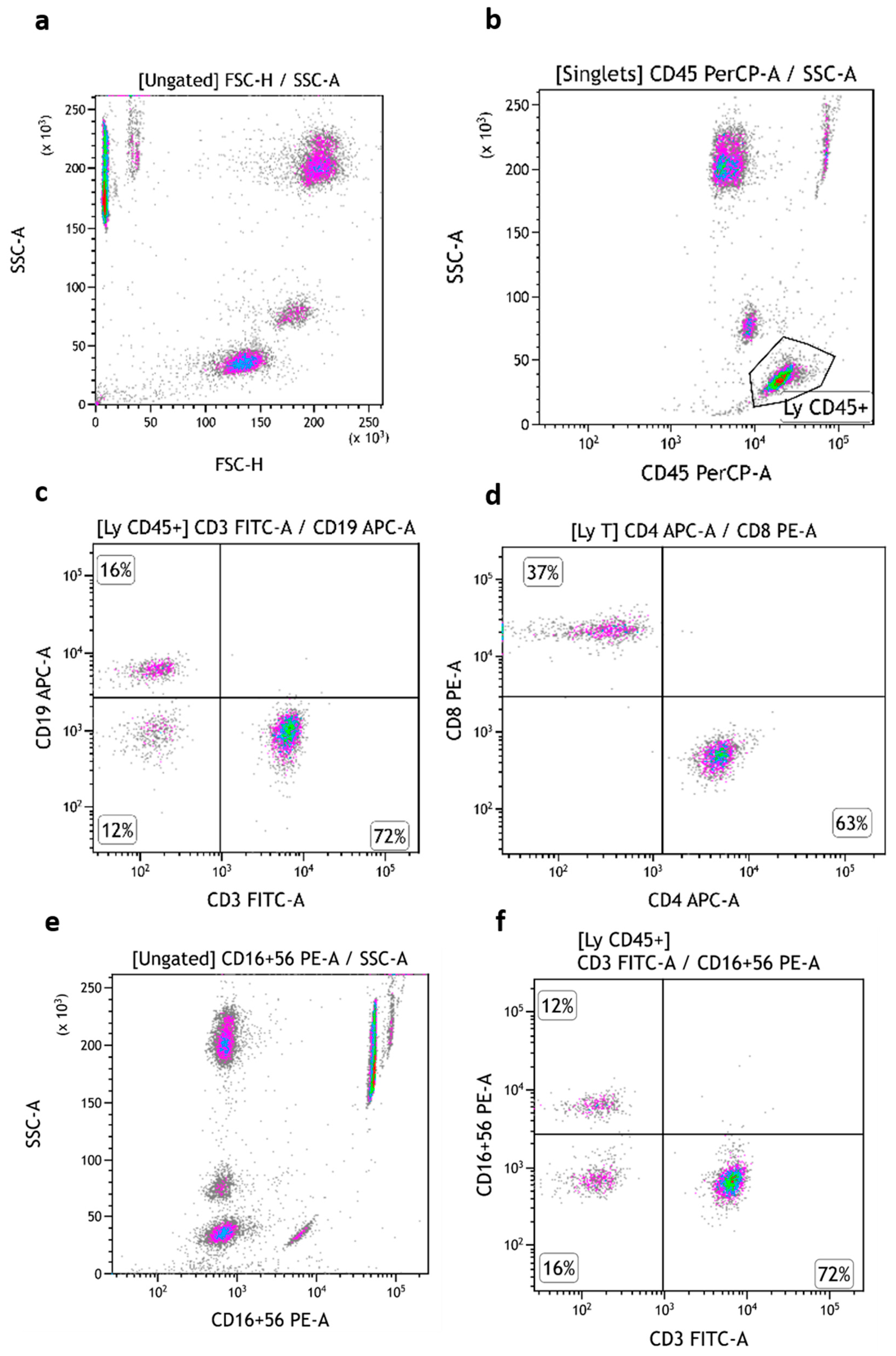 TruCytes analyzed on FACSCanto (with Trucount tubes): light scatters (a); CD45 (b), CD3/CD19 (c), CD4/CD8 (d) and CD16-CD56 (e,f). Data re-analyzed on Kaluza.