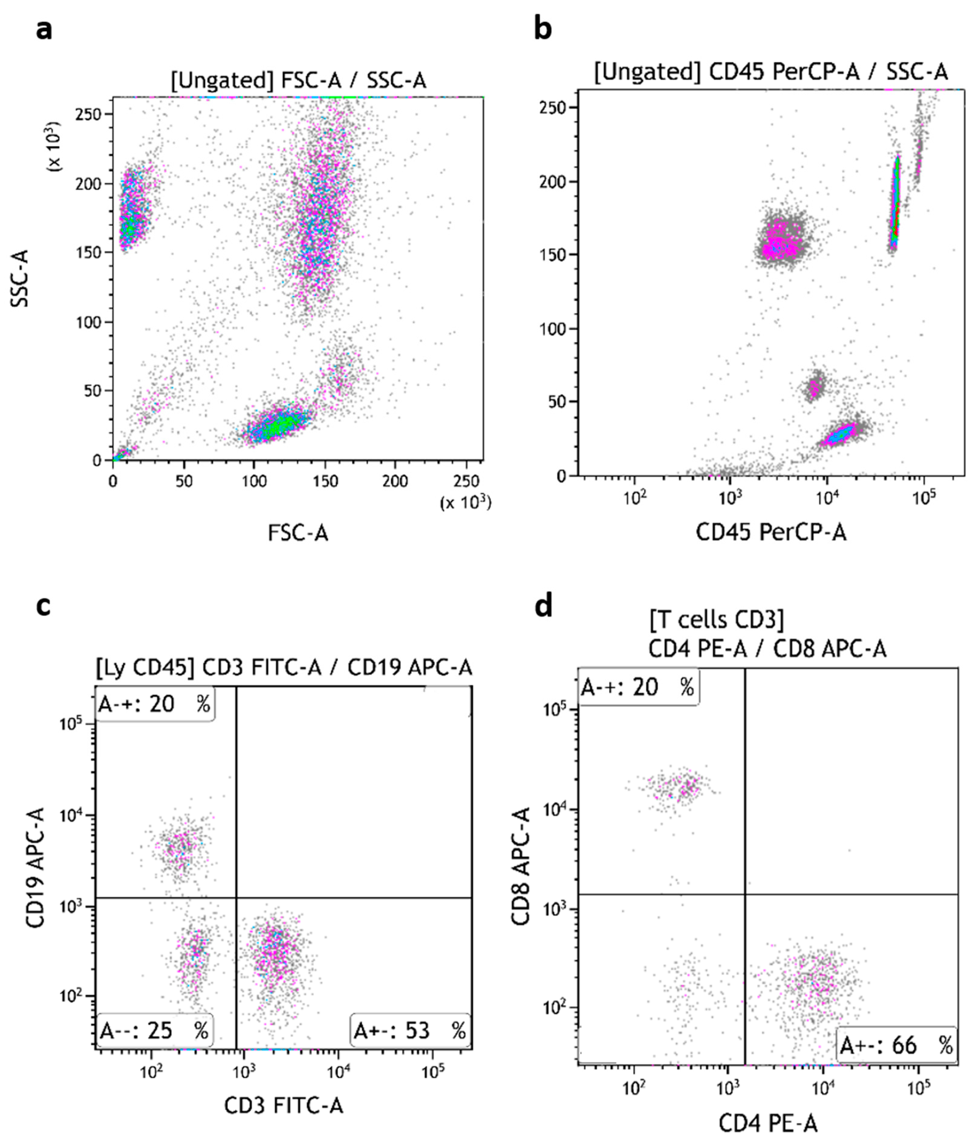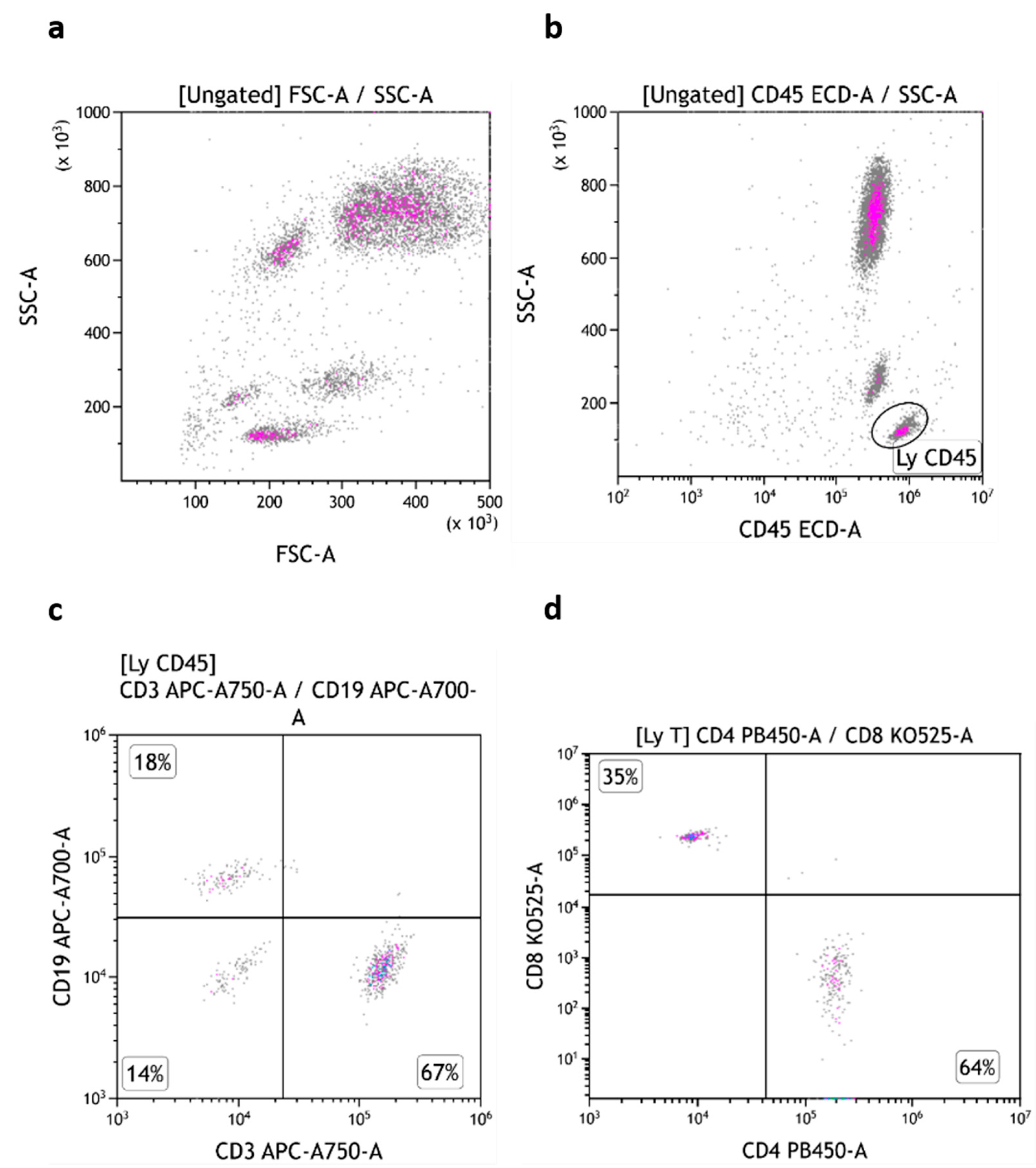 TruCytes analyzed on DxFLEX (with Flow-Count beads): light scatters (a); CD45 (b), CD3/CD19 (c) and CD4/CD8 (d). Data re-analyzed on Kaluza.