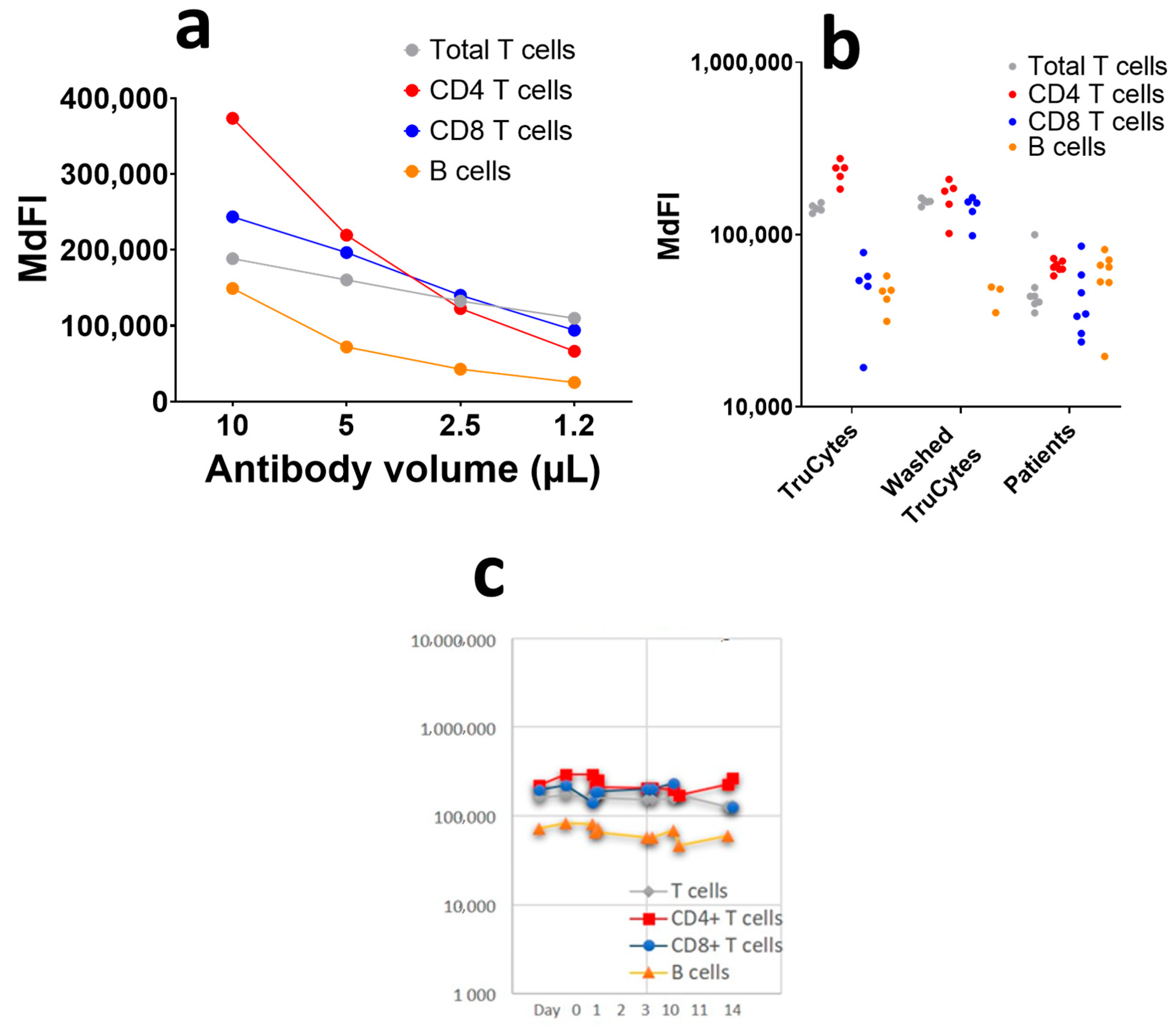 Figure 7a). This suggests that 10 µL of antibodies for 100 µL of TruCytes was not enough to reach saturation, which was most probably due to an excess of antigen expression on Trucytes compared to human leukocytes. Despite the fact that the antibodies were not saturating, the TruCytes’ MdFI appeared to be very stable in five repeats (
