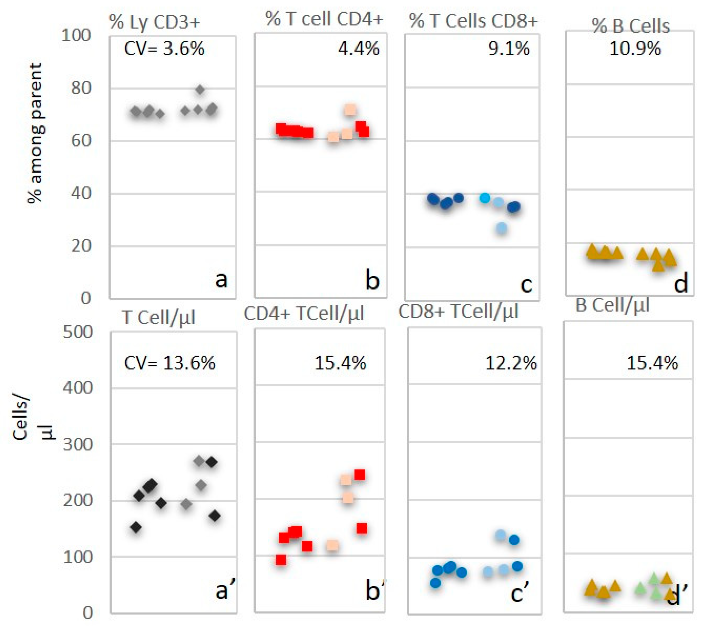 Figure 8) displayed CV values of 3.6% for T cells, 4.4% for CD4+ T cells, 9.1% for CD8+ T cells, and 10.9% for B cells. Absolute counting was also performed using either Trucount tubes or Flow-Count beads, resulting in CV values of 13.6% for T cells, 15.4% for CD4+ T cells, 12.2% for CD8+ T cells, and 15.4% for B cells.