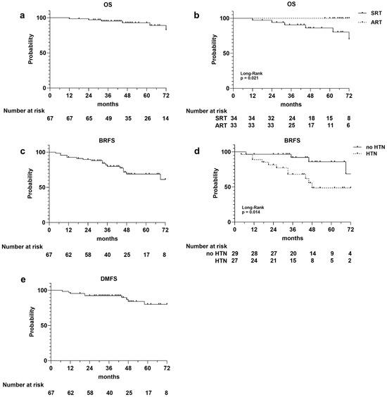 Kaplan–Meier survival curves illustrating the following: overall survival (OS) curves for entire population (a), for adjuvant (ART) and salvage (SRT) radiotherapy cohorts (b); biochemical relapse-free survival (BRFS) for the entire population (c), and for patients with and without hypertension (d); disease metastasis-free survival (DMFS) for entire population (e). Number at risk is reported at the bottom of each curve.