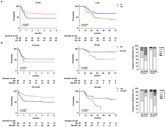 Panel (a) Toxicity-free survival curves for acute GI and GU toxicity and for late GI and GU toxicity. Number at risk is reported at the bottom of each curve. Panel (b) Toxicity-free survival curves for acute and late GI and GU toxicities according to radiotherapy volumes: prostate bed (PB) vs. prostate bed + whole pelvis (PB + WP). Number at risk is reported at the bottom of each curve. In the stacked bar charts are the frequency distributions of acute and late GI/GU toxicity grades in PB and PB + WP groups, respectively.