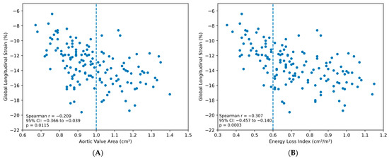 Correlation analyses between AVA, ELI, and GLS were performed using Spearman’s rank correlation coefficient for the overall cohort and separately for subgroups defined by AS severity (severe: AVA < 1.0 cm2; moderate: AVA 1.0–1.5 cm2). Correlation coefficients were compared to evaluate whether ELI demonstrated superior association with GLS compared to AVA.