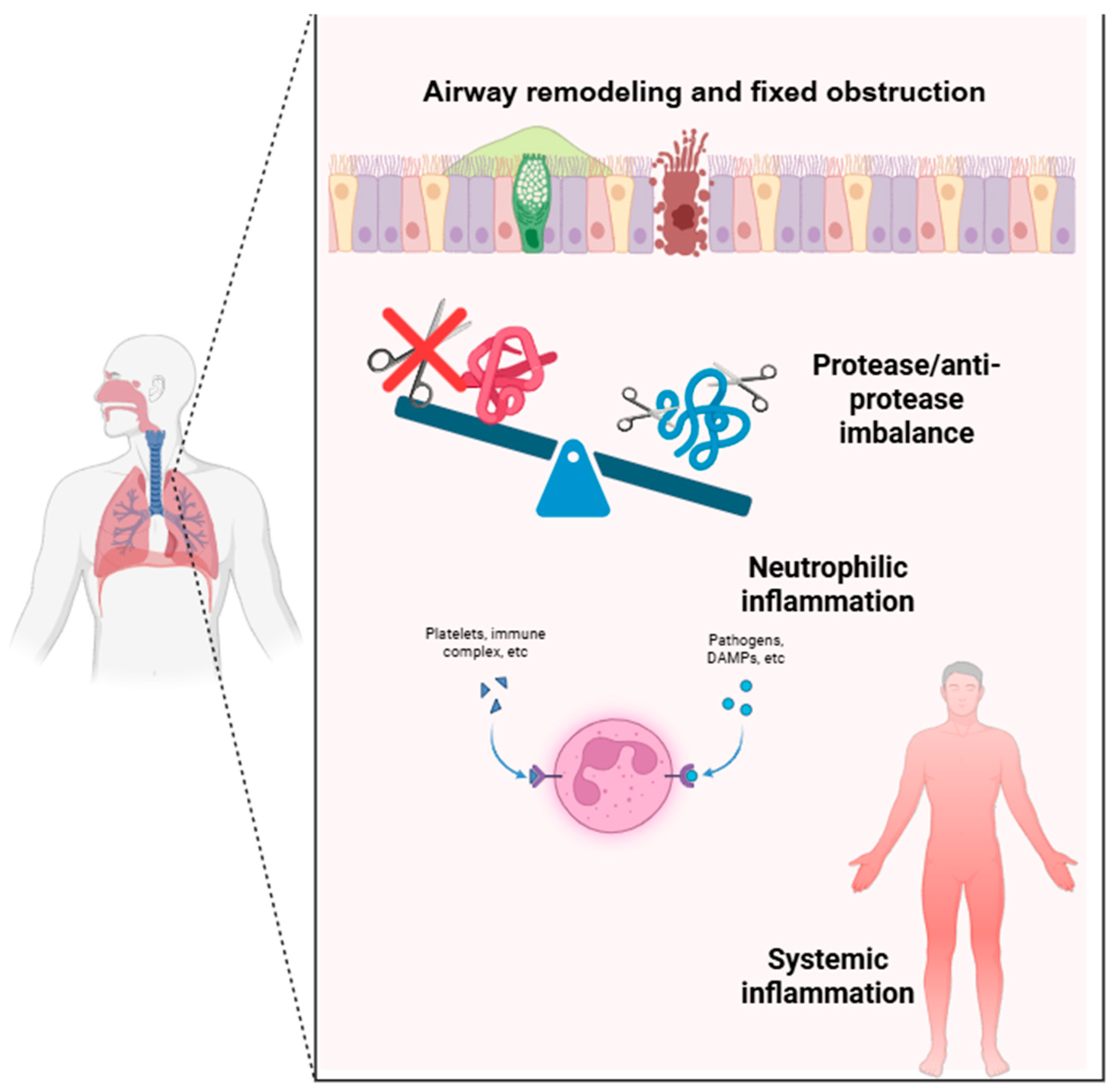 - In individuals with AATD, the deficiency of AAT—the main inhibitor of NE—leads to unregulated proteolytic activity, resulting in degradation of the extracellular matrix and bronchial epithelium; the damaged bronchial epithelium becomes more permeable to allergens, pathogens, and irritants, enhancing airway hyperresponsiveness and sustaining inflammation. Similarly, elevated levels of NE have been observed in severe neutrophilic asthma, suggesting that an imbalance between proteases and antiproteases may represent a shared mechanism [41,43].