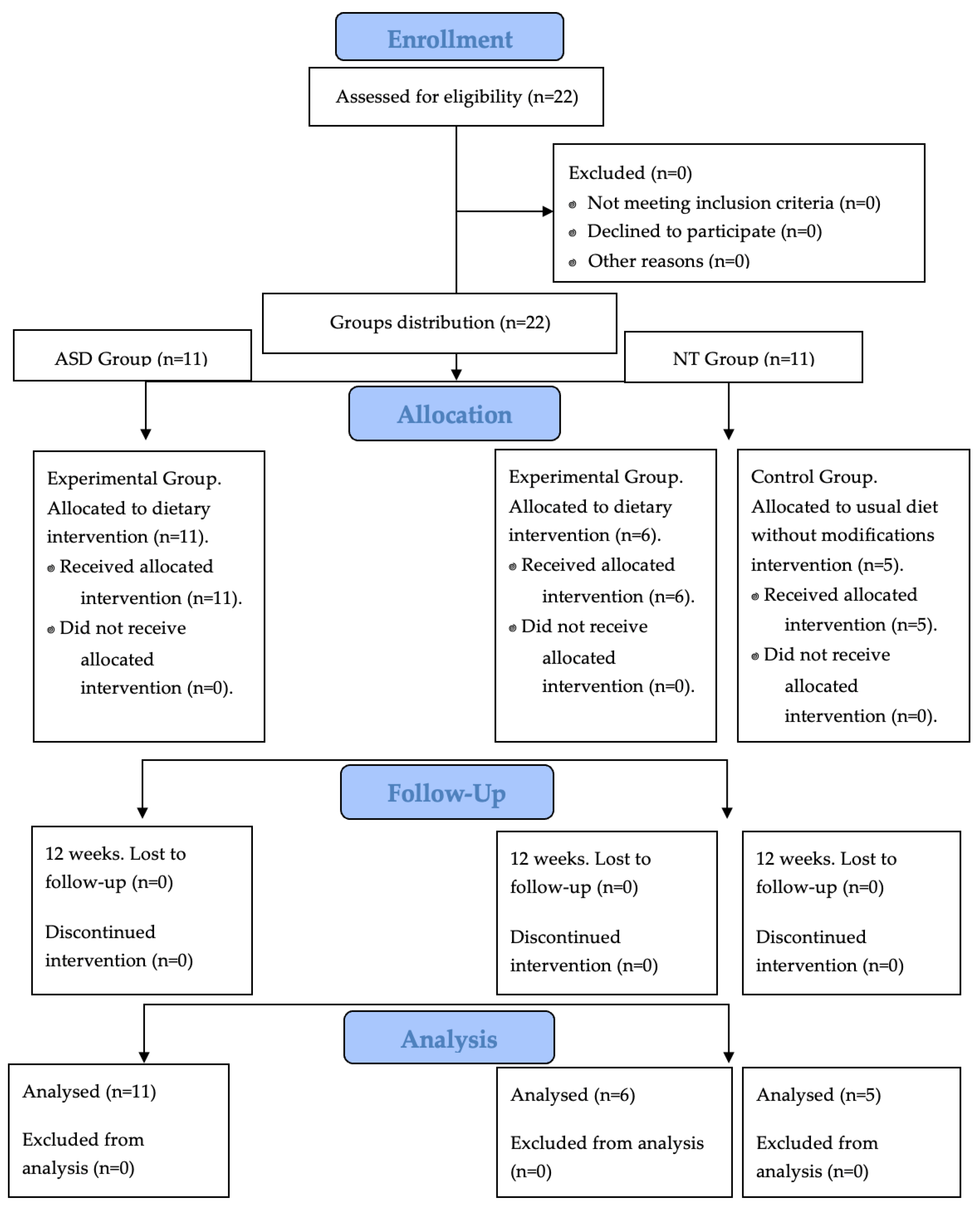 The design included two main groups: children with Autism Spectrum Disorder (ASD) and neurotypical participants drawn from the same geographic region. All children with autism spectrum disorder (ASD) were assigned to the dietary intervention group, as withholding nutritional intervention was considered ethically inappropriate given caregiver interest and the exploratory nature of the study. Neurotypical participants were allocated to either the dietary intervention group or a non-intervention control group based on caregiver consent, feasibility of adherence to the dietary protocol, and scheduling availability. Throughout the manuscript, the term “NT-Control” is used to denote neurotypical participants who did not receive the dietary intervention and served as a non-intervention comparison group. This group represented an observational reference condition characterized by cognitive and biological stability over the study period rather than a randomized experimental control. Therefore, allocation was pragmatic rather than randomized, and no participants were excluded based on group assignment. This allocation strategy was selected to maximize the feasibility and ecological validity in a real-world pediatric setting. Consequently, analytical approaches emphasizing within-subject change, mixed-effects modeling, and Bayesian inference were employed to appropriately account for the non-randomization and small sample size.