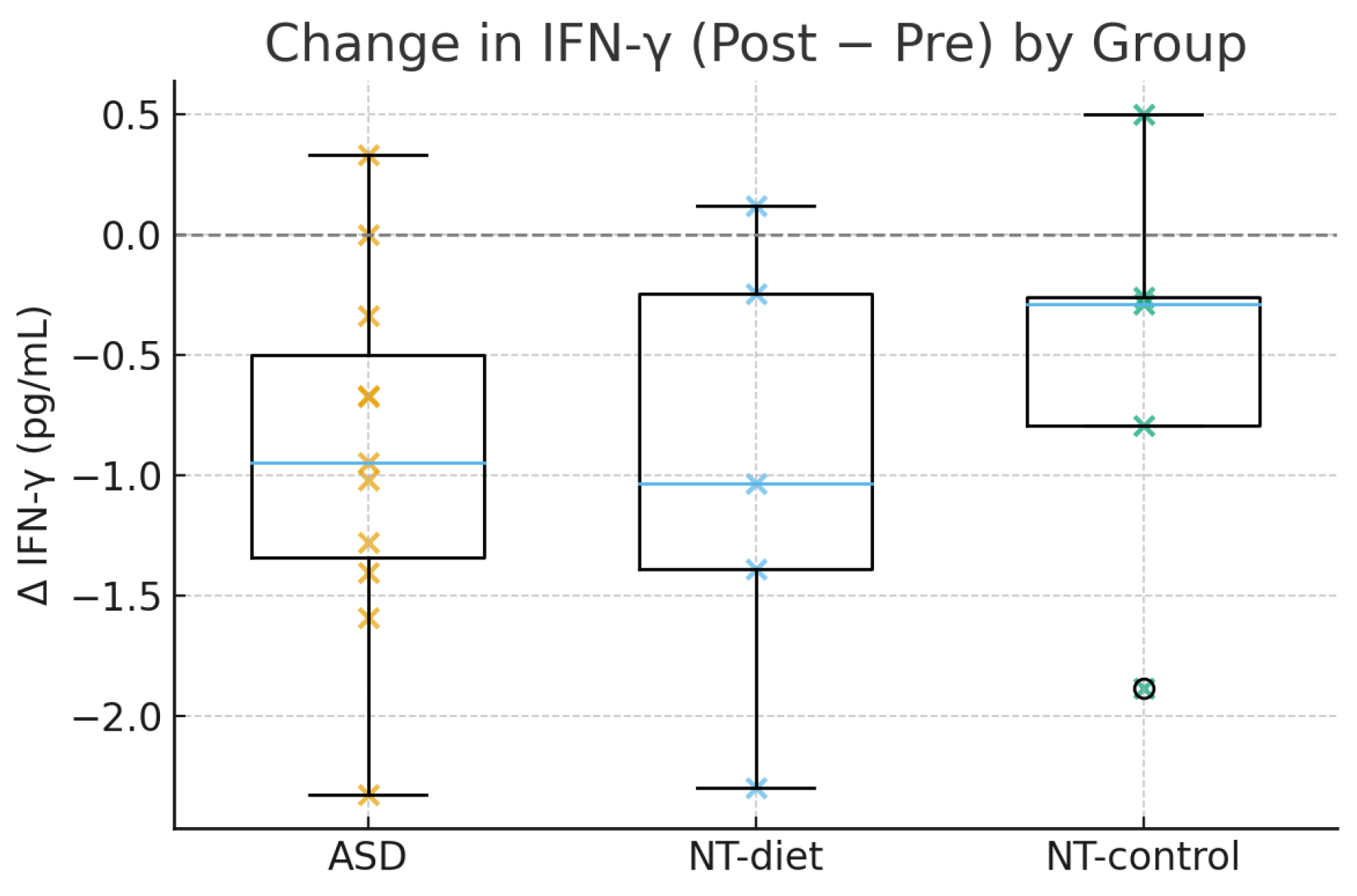 Figure 2, the distribution of individual change scores (ΔIFN-γ = post − pre) showed a clear shift in the ASD group compared with both NT-diet and NT-control children. Post hoc contrasts confirmed a marked decrease in IFN-γ among ASD participants (β = −0.42, 95% CI −0.70 to −0.15,