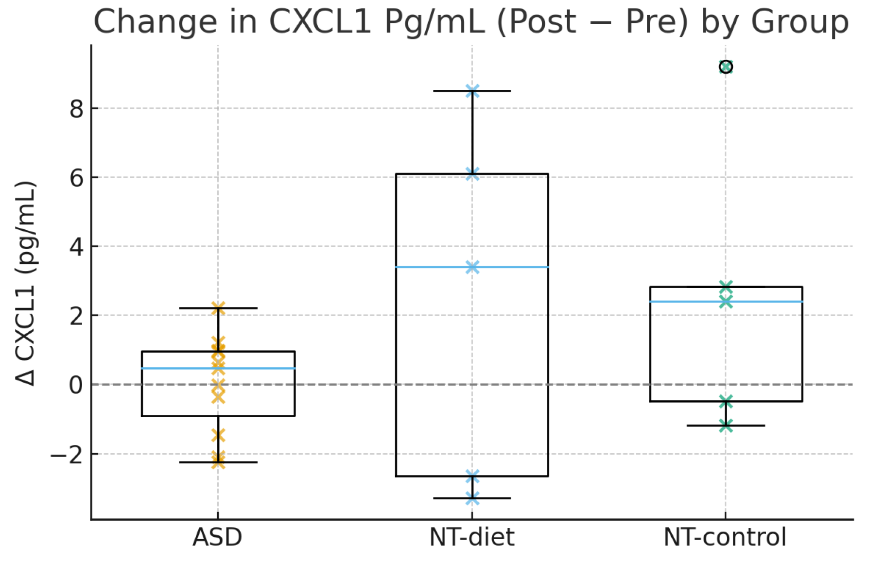 p = 0.04). In contrast, the NT-diet participants exhibited a broader distribution with both positive and negative changes, suggesting higher biological noise and weaker responsiveness to the intervention. Interestingly, two NT-control subjects showed substantial positive increases in CXCL1, further supporting the notion that the observed CXCL1 reduction is specific to ASD and unlikely to represent a non-specific temporal effect. These findings are especially meaningful considering that CXCL1 reductions were strongly predictive of neurocognitive improvement, particularly in executive flexibility and attentional control.