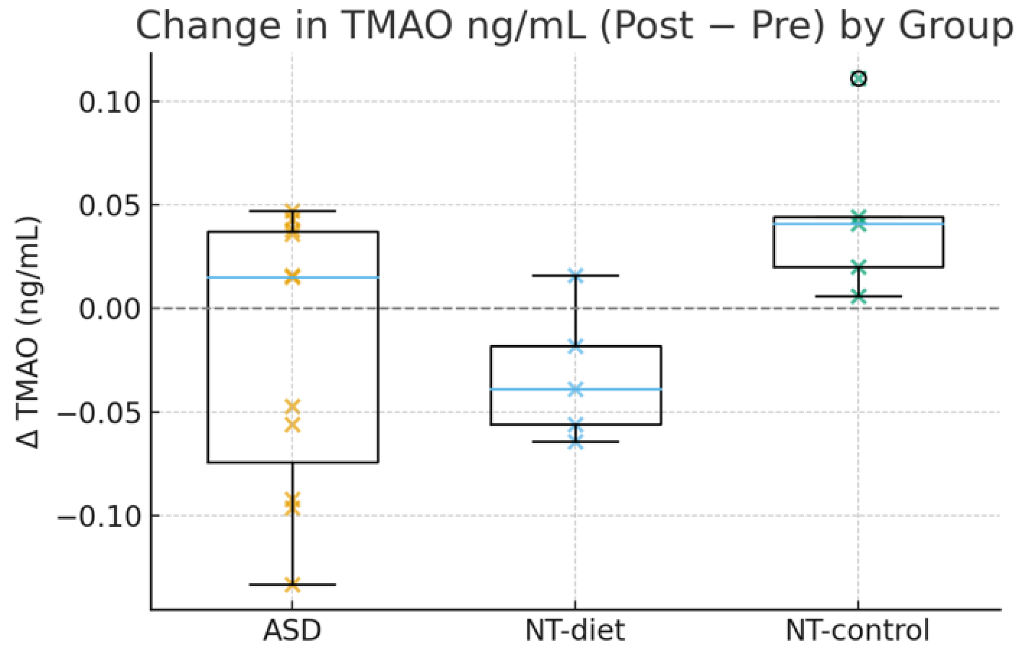 In contrast, the NT diet group exhibited minimal change, with ΔTMAO values clustering near zero, whereas NT controls showed positive increases, suggesting progressive metabolic divergence in the absence of dietary modification. These effects highlight that the anti-inflammatory diet exerts a selective normalizing effect on TMAO metabolism that is unique to ASD.