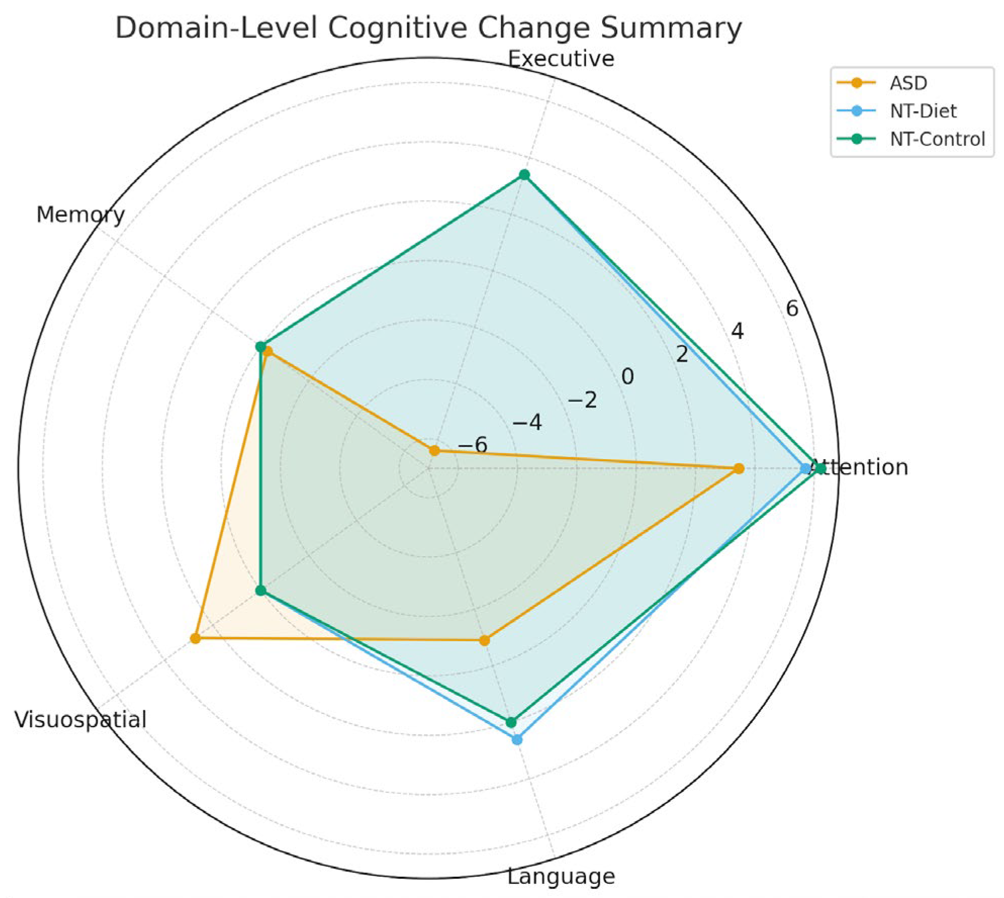 Taken together, these domain-level signatures indicate that the anti-inflammatory diet produced the most substantial and widespread cognitive benefits in ASD, more selective improvements in NT-Diet children, and no meaningful changes in untreated neurotypical controls. This pattern underscores the differential neurocognitive responsiveness of each group and provides a system-level view of the cognitive impact of the intervention.